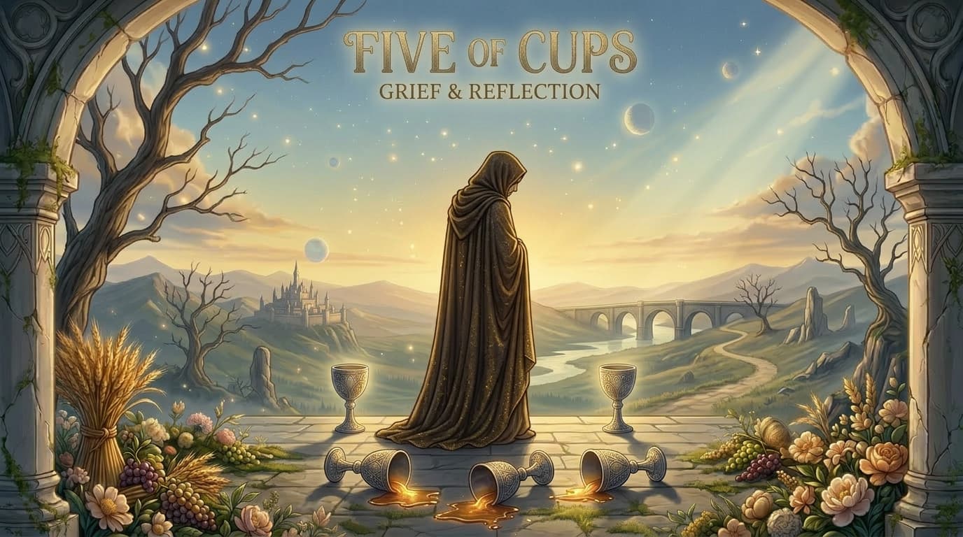 Discover Five of Cups tarot meaning on Orelune, including loss, emotional insight, love guidance, career setbacks, symbolism, yes/no interpretation, and free tarot reading.