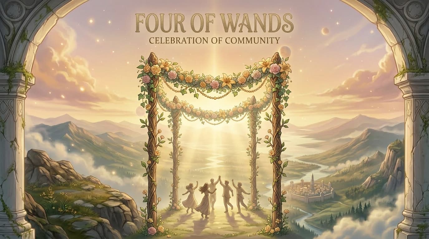Explore Four of Wands tarot meaning on Orelune, including celebration, stability, love, career insights, symbolism, yes/no interpretation, and free tarot reading guidance.