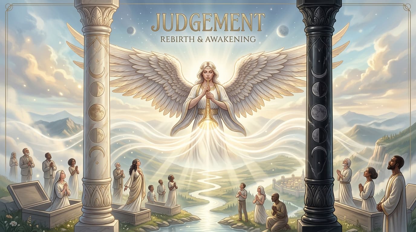 Discover Judgement tarot card meaning on Orelune, including renewal, reflection, love, career insights, symbolism, yes/no guidance, and free tarot reading support.