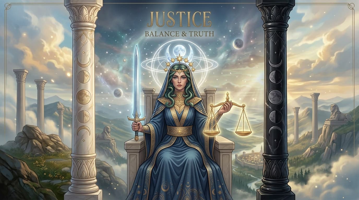 Discover Justice tarot card meaning on Orelune, including fairness, truth, balance, love, career guidance, symbolism, yes/no interpretation, and free tarot reading insights.