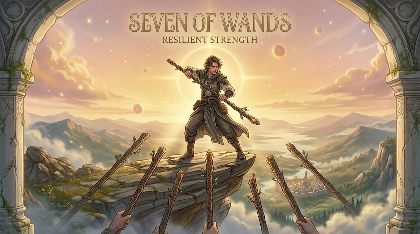 Discover Seven of Wands tarot meaning on Orelune, including defense, competition, love insights, career challenges, symbolism, yes/no guidance, and free tarot reading interpretation.