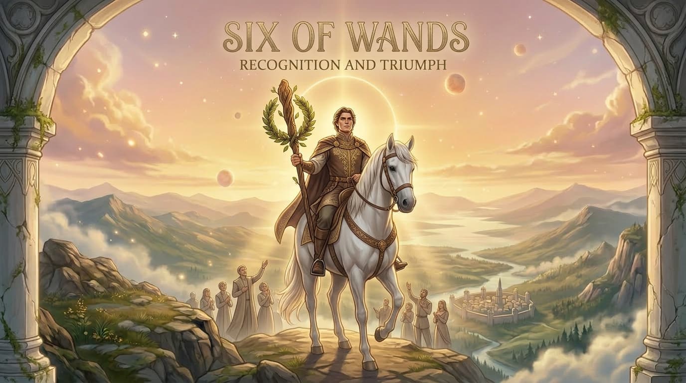 Explore Six of Wands tarot meaning on Orelune, including victory, recognition, love insights, career success, symbolism, yes/no interpretation, and free tarot reading guidance.