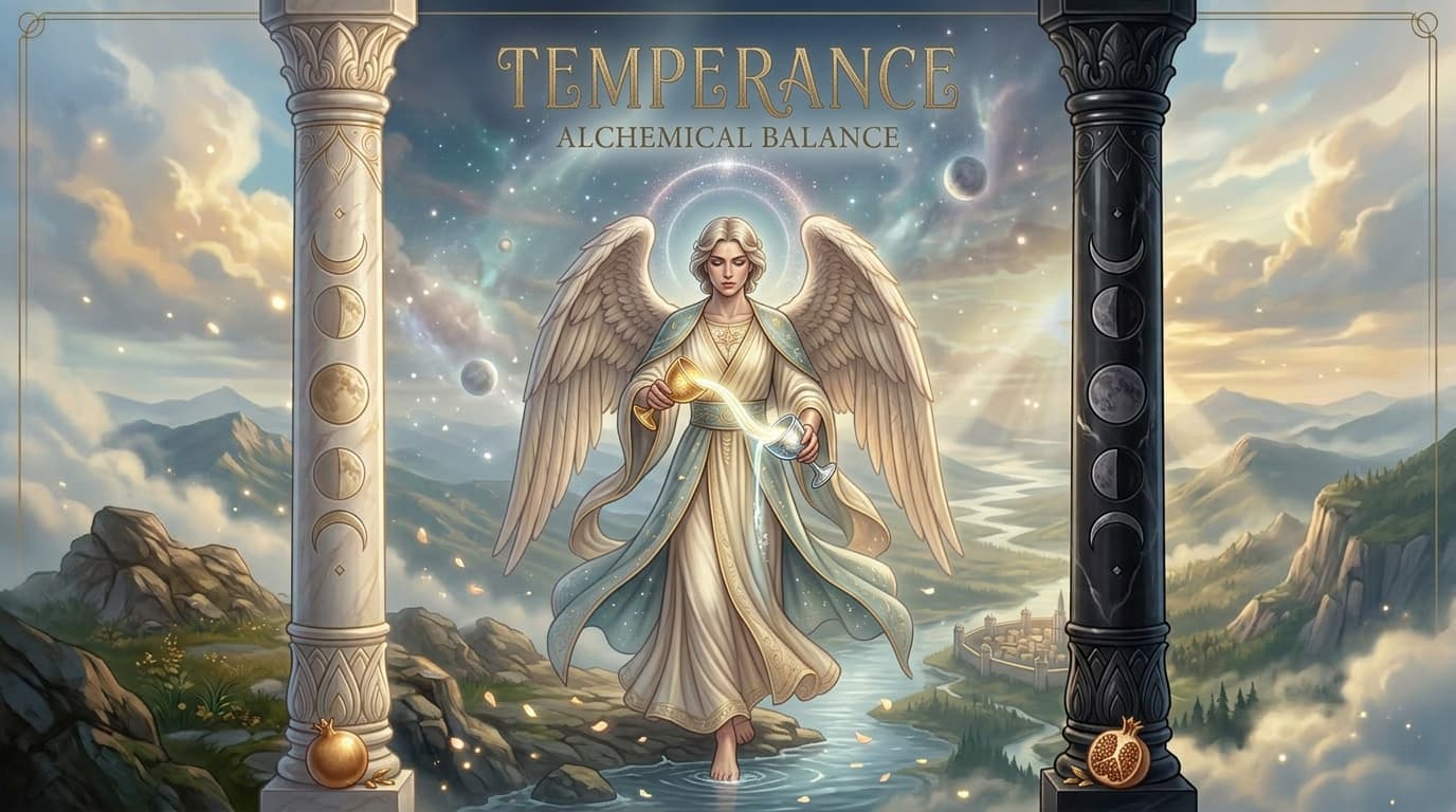 Temperance represents balance, harmony, moderation, and the careful blending of opposites in life.