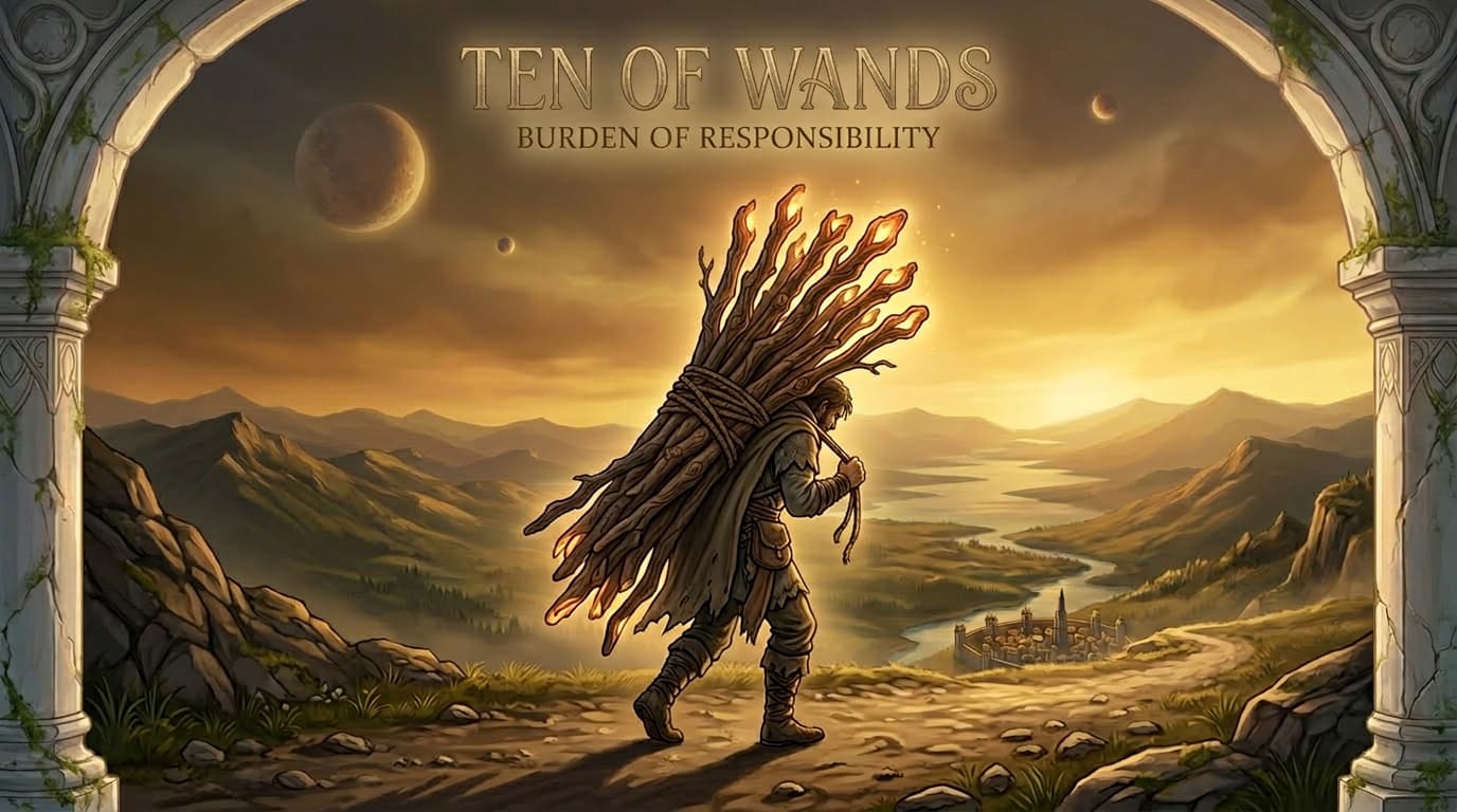 The Ten of Wands represents carrying heavy responsibilities, hard work, and the feeling of being overburdened. It signals the completion of a cycle, but also warns of burnout if you take on too much.