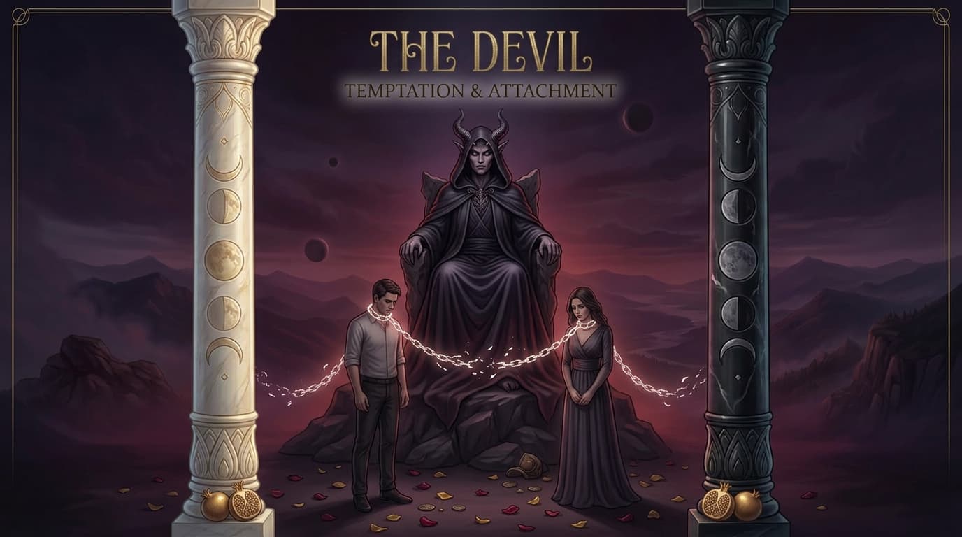 The Devil represents temptation, attachment, materialism, and the patterns that bind us.