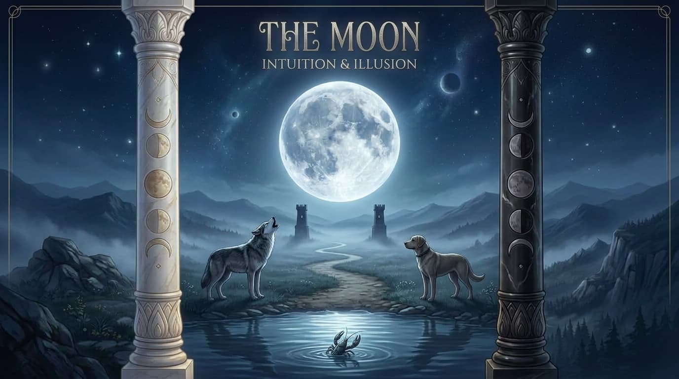 Discover The Moon tarot card meaning on Orelune, including intuition, dreams, love, career insights, symbolism, yes/no guidance, and free tarot reading support.