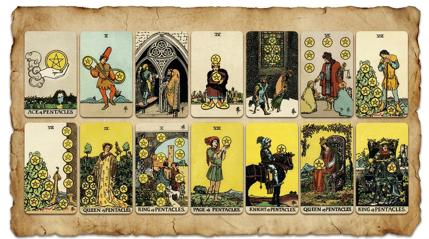 The Suit of Pentacles represents work, resources, and long-term growth, showing how effort becomes tangible results. Moving from new opportunities to lasting stability, it emphasizes patience, consistency, and building a secure foundation over time.