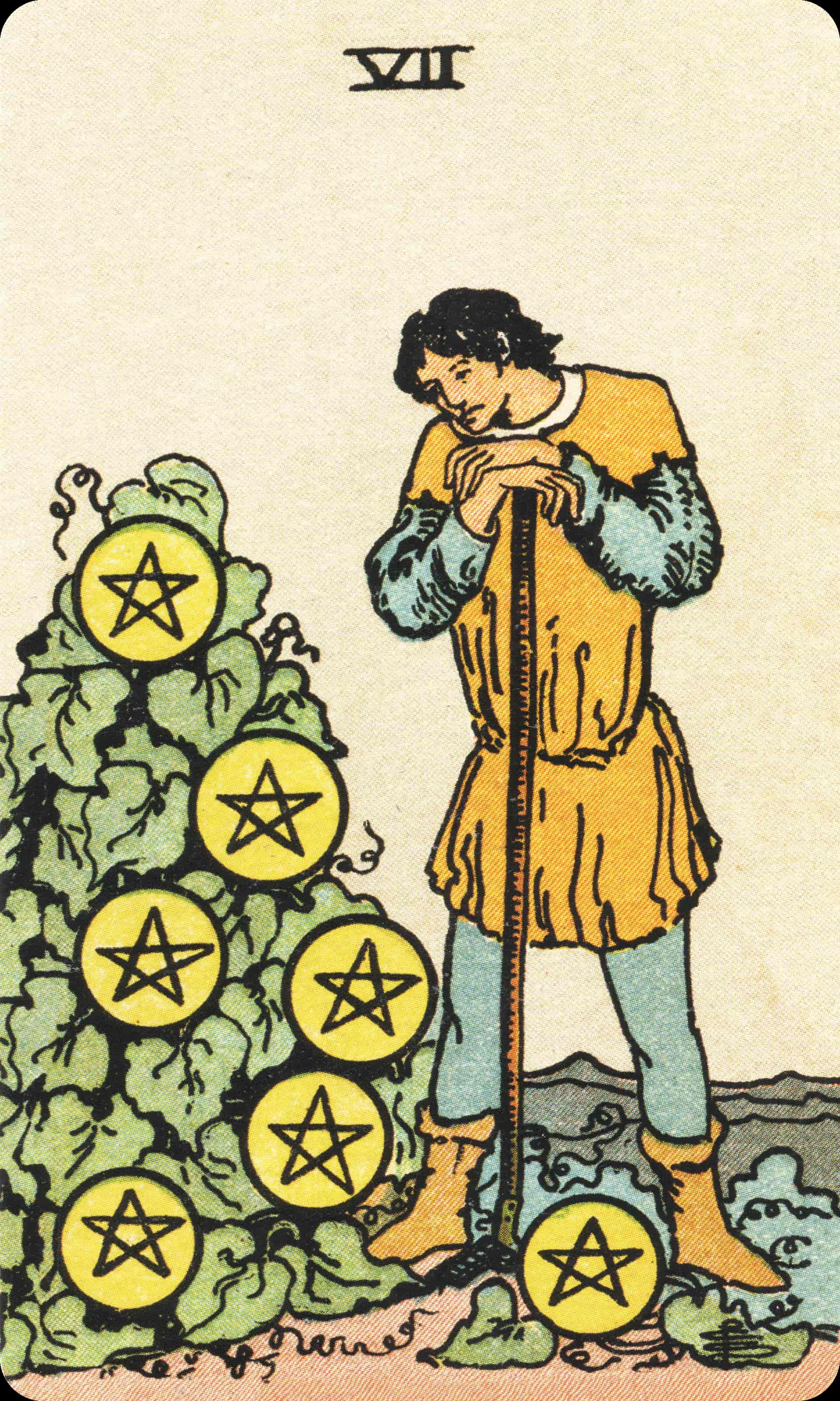 The Seven of Pentacles represents long-term effort and reflection.
