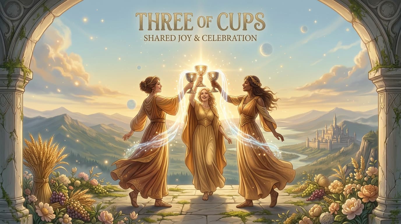 Upright, the Three of Cups symbolizes celebration, social harmony, and emotional support from friends. It often appears during reunions, parties, engagements, or happy milestones.