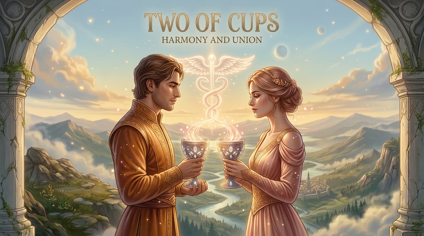 Upright, the Two of Cups symbolizes mutual love and balanced partnership. It represents emotional harmony, romantic attraction, reconciliation, or forming meaningful bonds.