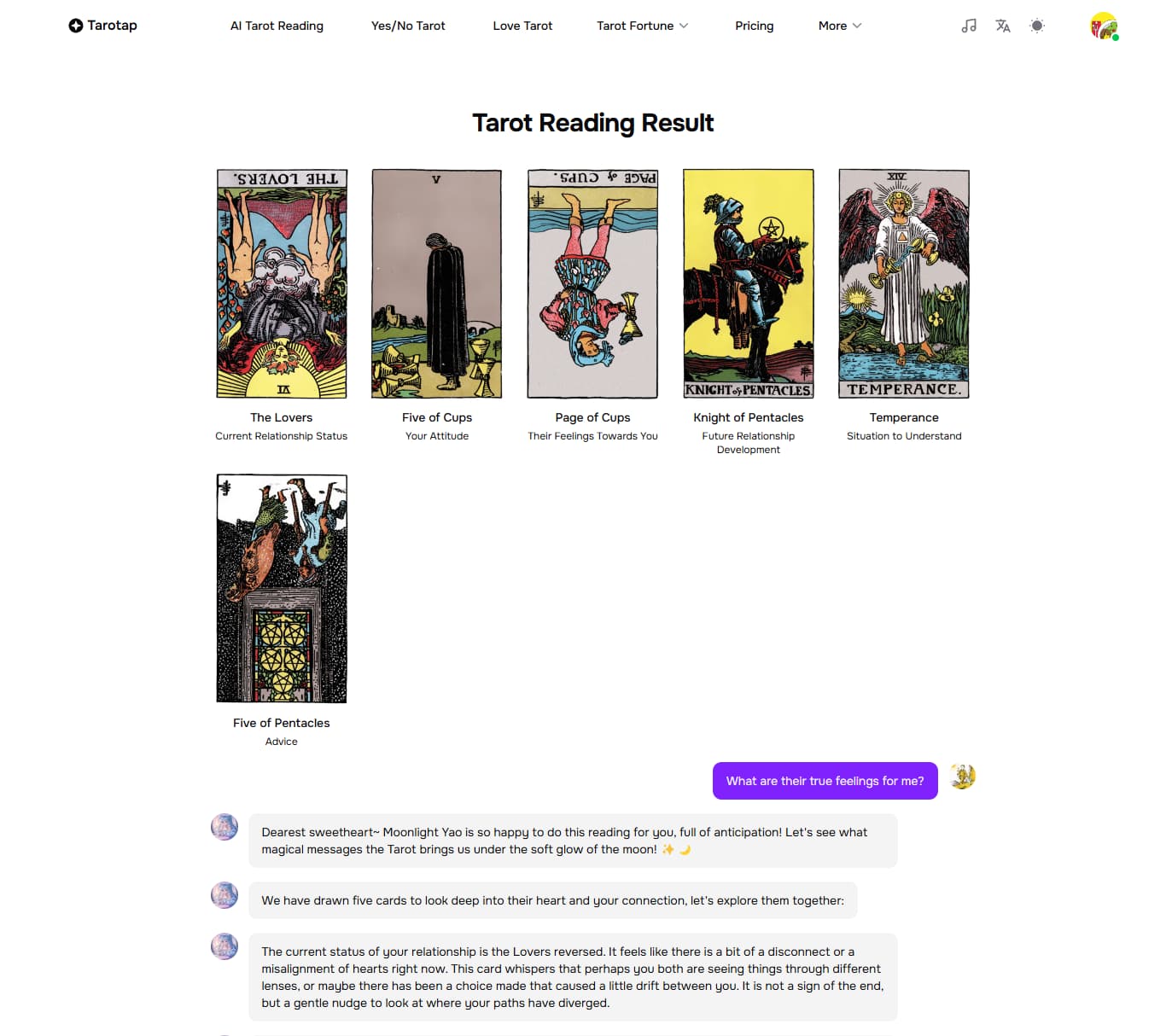 Tarotap is one of the more straightforward AI tarot tools. You ask a question, draw cards, and it generates an interpretation almost instantly.