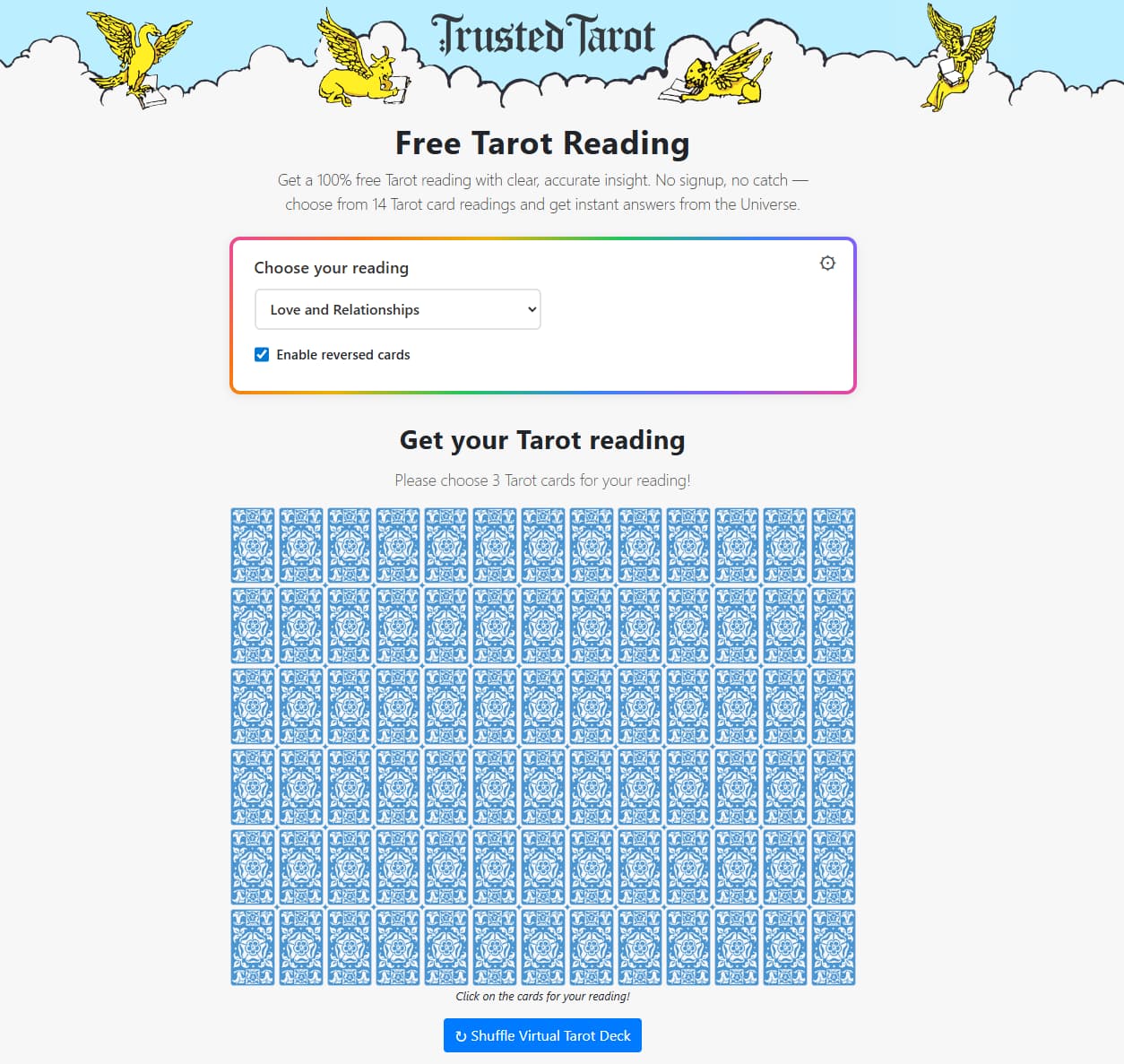 Trusted Tarot feels very close to the older generation of online tarot sites. You choose a spread, draw cards, and read predefined interpretations.