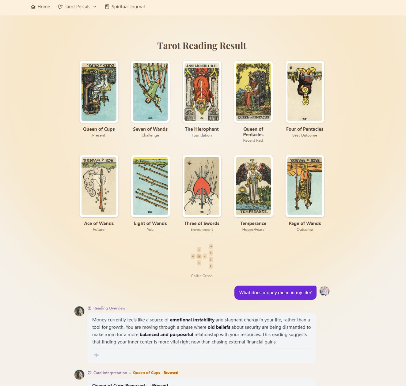 Instead of reducing the experience to either fixed meanings or quick summaries, it treats a reading more like a process. There is a clear sense of progression from the question, to the cards, and then into a layered interpretation. The output is not just a block of text, but something that feels more guided and intentional.