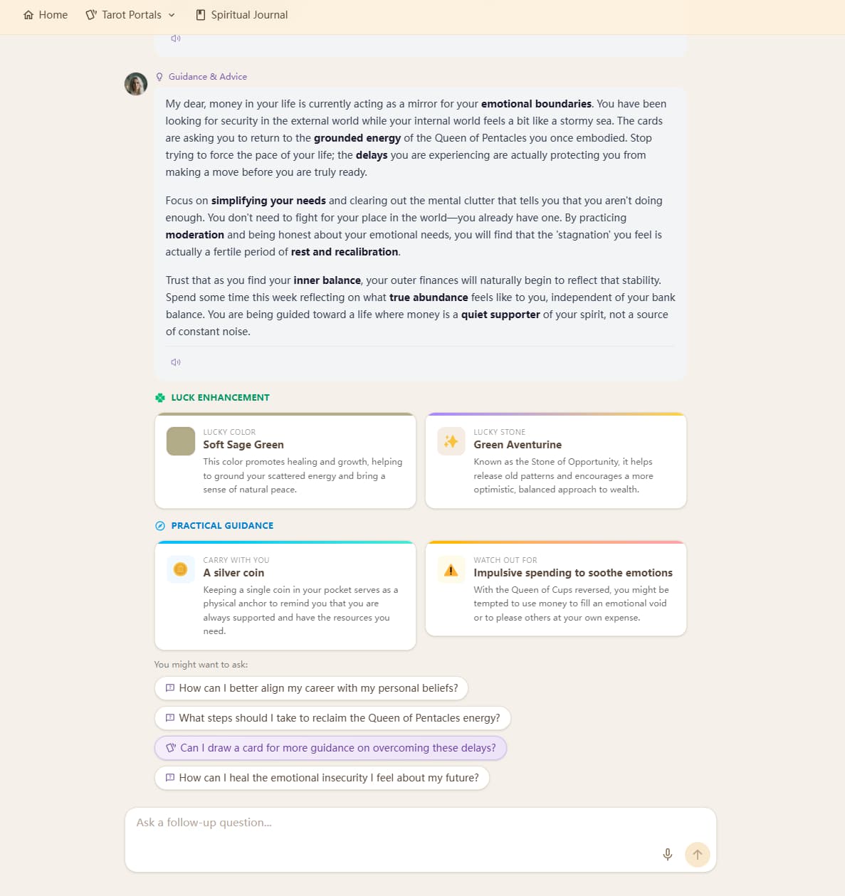 In most tarot tools, once the interpretation is generated, that's essentially the end of the interaction. You either accept it or start over with a new spread. Here, the reading feels more like an ongoing thread rather than a one-time result.