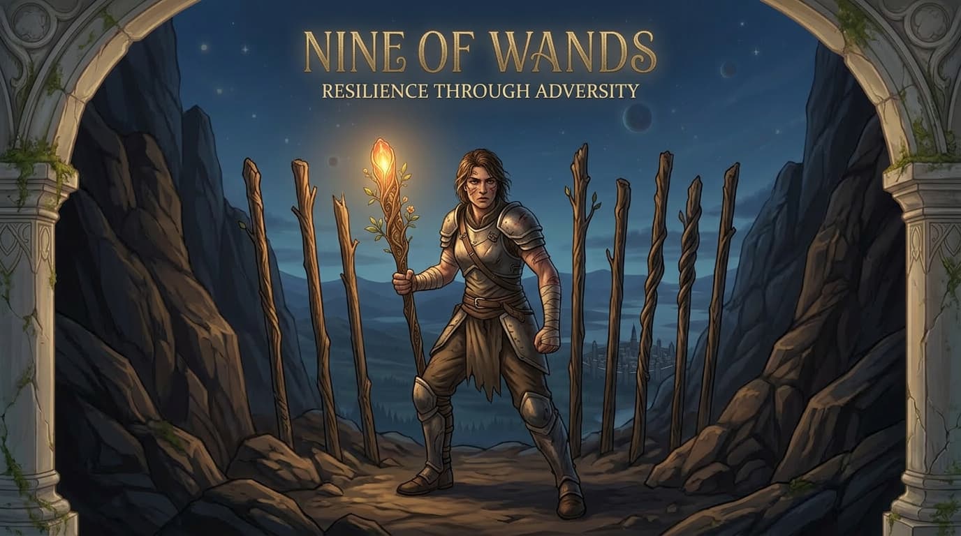 Discover Nine of Wands tarot meaning on Orelune, including resilience, endurance, love insights, career persistence, symbolism, yes/no guidance, and free tarot reading interpretation.
