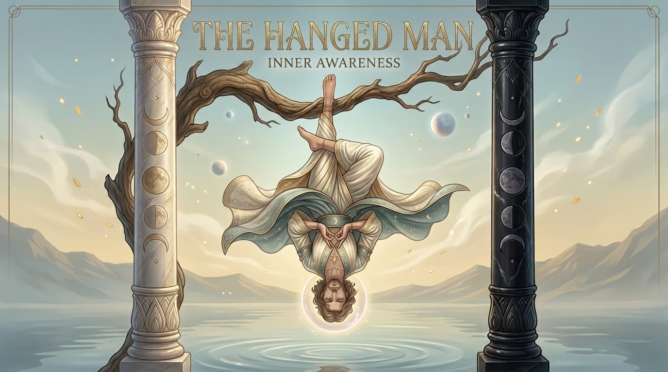 Discover The Hanged Man tarot card meaning on Orelune, including surrender, perspective, love, career insights, symbolism, yes/no guidance, and free tarot reading support.